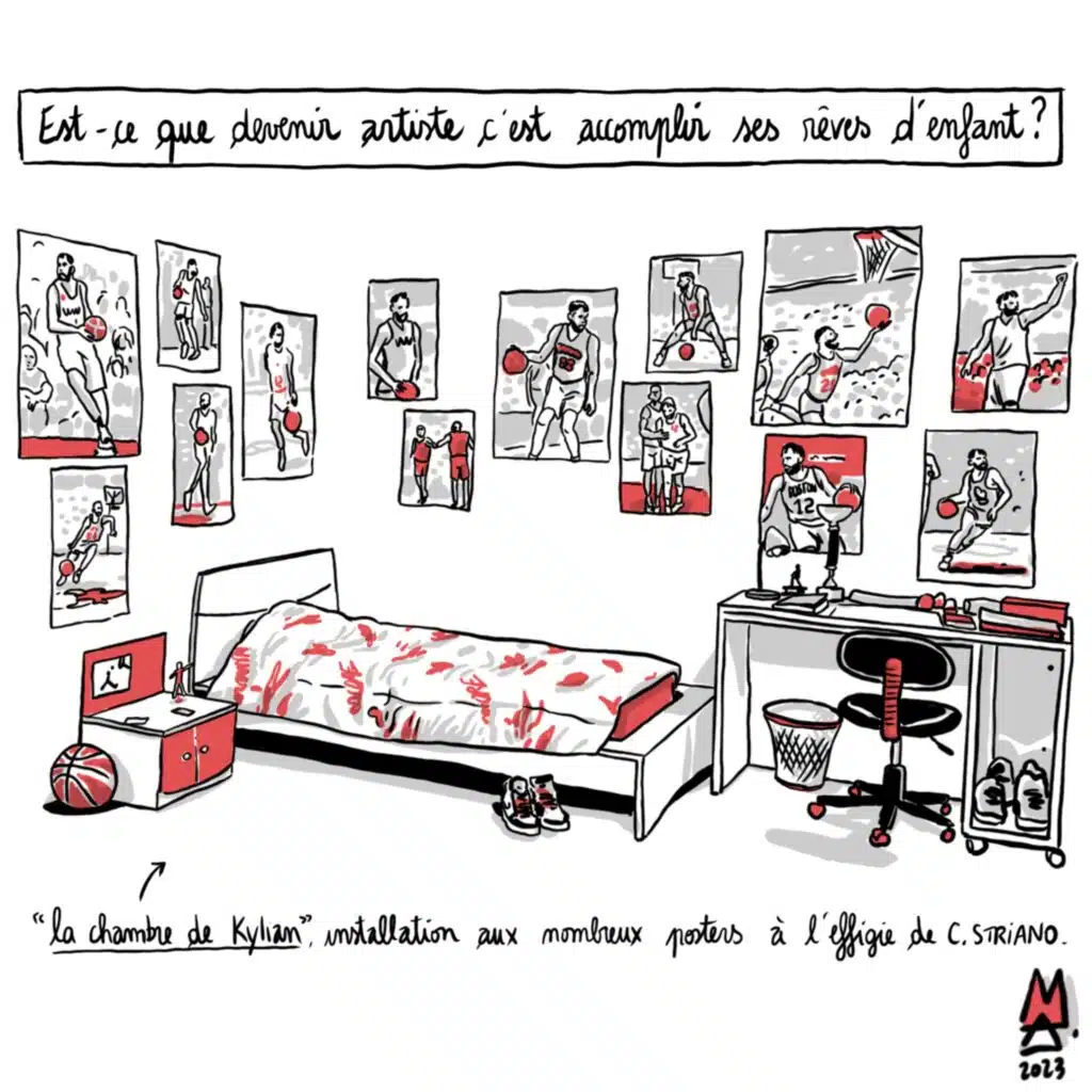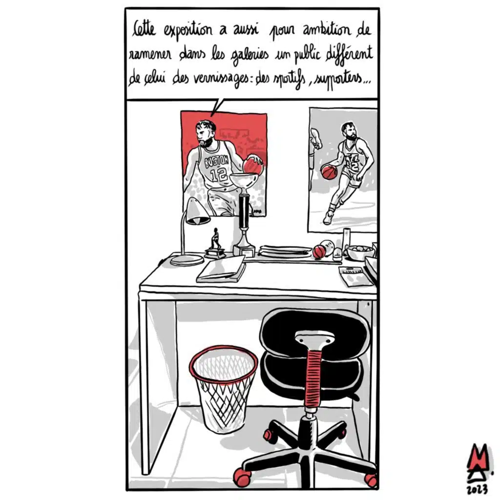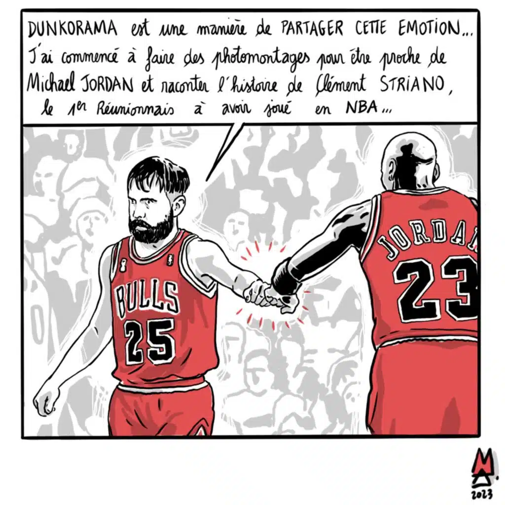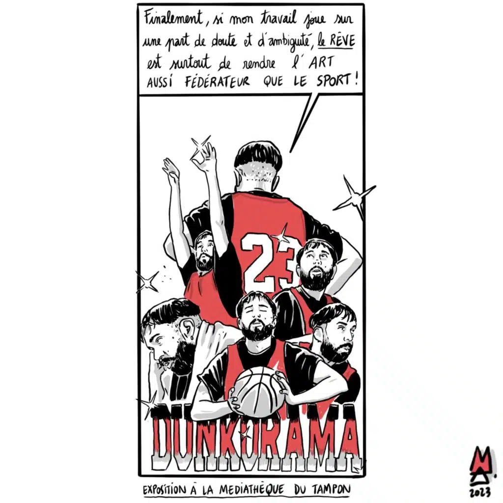 Cette semaine, Alex M propose un reportage dessiné sur l’exposition « Dunkorama IV » de Clément Striano, à retrouver à la Médiathèque du Tampon, jusqu’au 24 septembre. L’exposition revient sur la carrière du 1er joueur de basket réunionnais ayant évolué en NBA. Est-ce que devenir artiste c’est accomplir ses rêves d’enfant ?