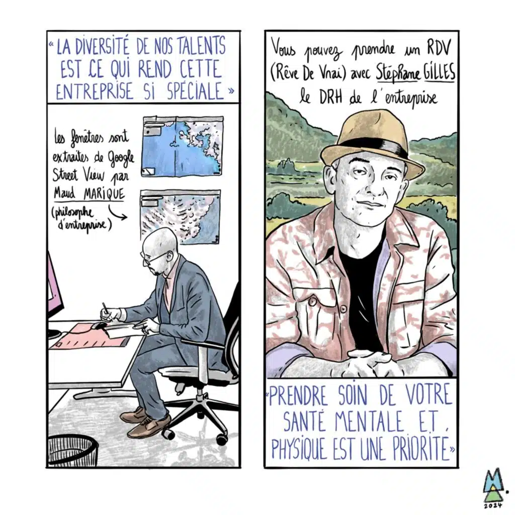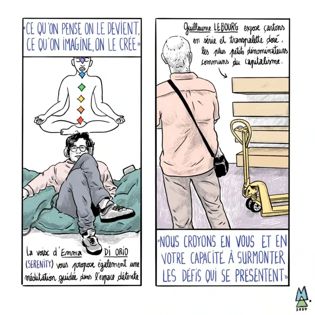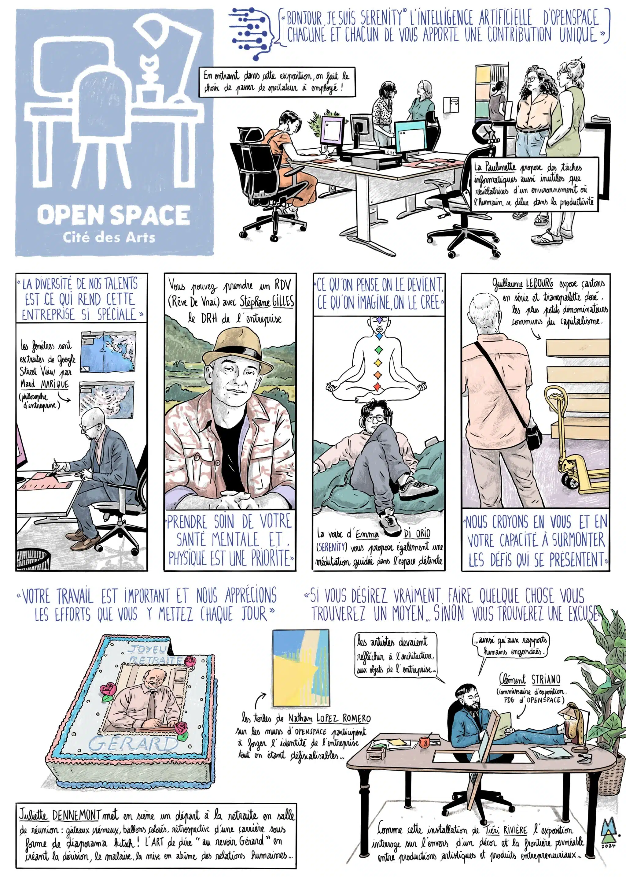 Cette semaine, Alex M propose un reportage dessiné sur « Openspace ». Cette exposition prend place à la Cité des arts à Saint-Denis. Clément Striano en est le chef d’orchestre. Il avait carte blanche et s’est entouré d’une dizaine d’artistes pour l’occasion.