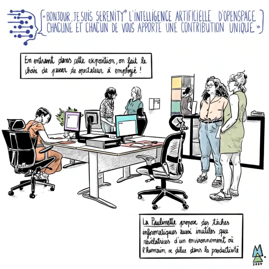 Cette exposition immersive rend perméable la frontière entre production artistique et produit entrepreneurial : si bien qu’en entrant dans la salle d’exposition de la Cité des arts nous ne savons plus si nous sommes spectateurs, employés ou artistes à notre tour. Heureusement, Sérénity, l’intelligence artificielle d’openspace est là pour nous rassurer et nous mettre sur la bonne voie….