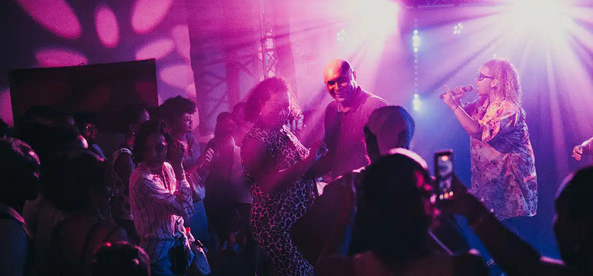 Nou lavé la fors reggae… apresa nou lavé la fors la vwa Marjorie Hoareau . Timid, la janm té tranm presk in pé avan mont su la senn mé inn fwa la mizik lé parti…. Popopo… Sort devan… Dériyér La vwa klér é fort Marjorie i baléiy tout su son pasaz.