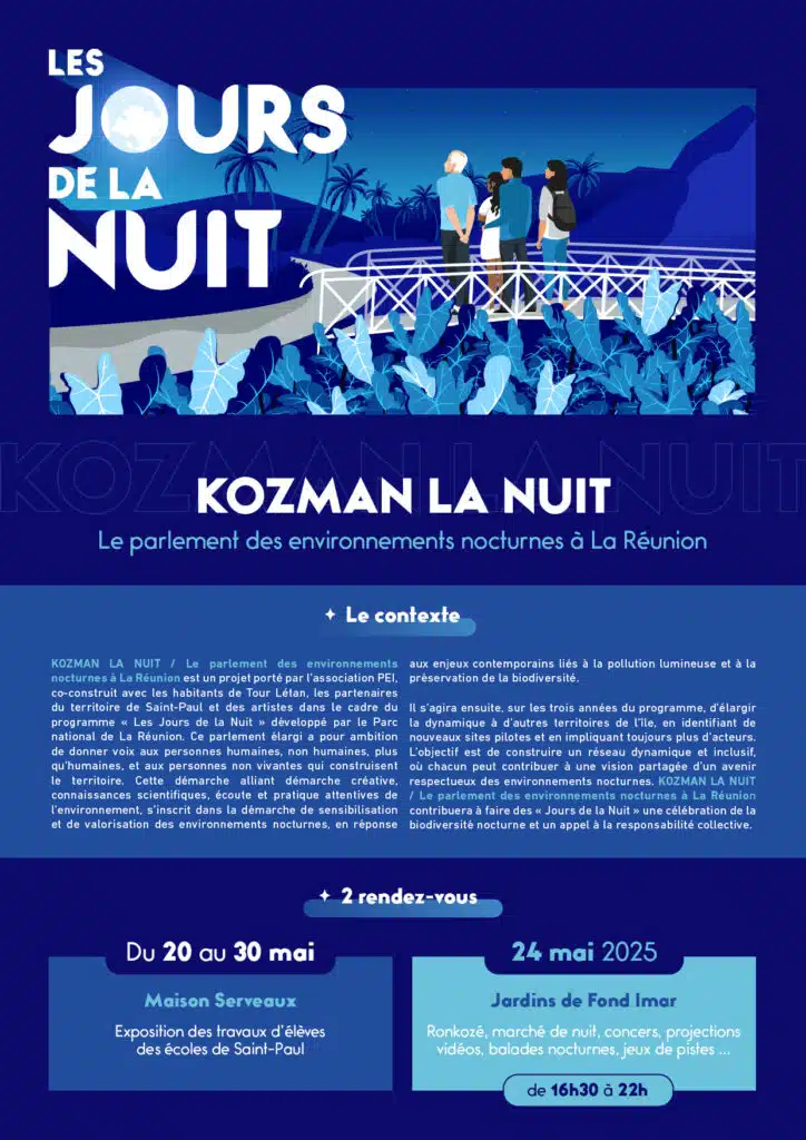 Kozman la nuit / Le parlement des environnements nocturnes à La Réunion est un projet porté par l’association PEI, co-construit avec les habitants de Tour Létan et les partenaires du territoire de Saint-Paul ainsi que des artistes intervenants, dans le cadre du programme « Les jours de la Nuit » développé par le Parc National de La Réunion.