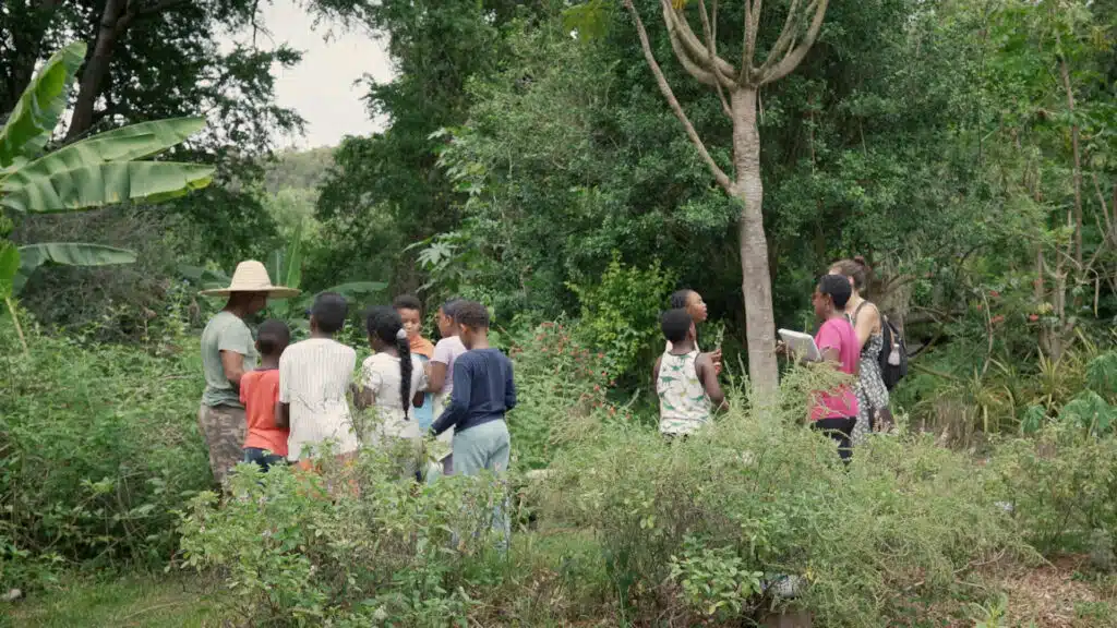 Visite du jardin de Paulo par les élèves de l’école de Barrage accompagnés de Natacha Praene. © Antonio Prianon