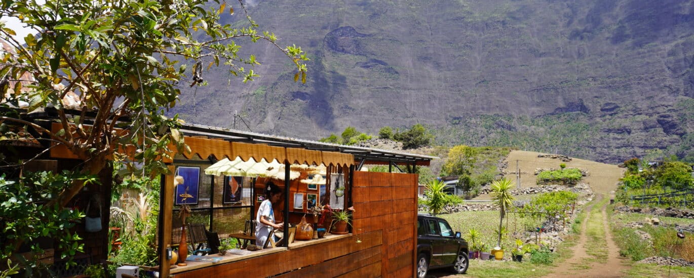 La première réflexion qui nous vient lorsque l’on trouve la Boutik de l'Artisanat du P’tit Bout du Monde, est la suivante : la promesse est tenue. C’est à l’Îlet à Cordes, au bout d’un petit chemin en terre, que cette maisonnette en bois, à laquelle on accède par la terrasse, accueille les visiteur·euse·s. Pour la trouver, il faut connaître. Car Aimejah, propriétaire de la boutique, ne souhaite pas particulièrement en faire la publicité. « Le fait de ne pas trop en parler, ça garde le côté surprise. » C’est grâce au bouche-à-oreille que ce petit coin de sérénité a fait sa place, au milieu des remparts du cirque de Cilaos et des carreaux de terre.