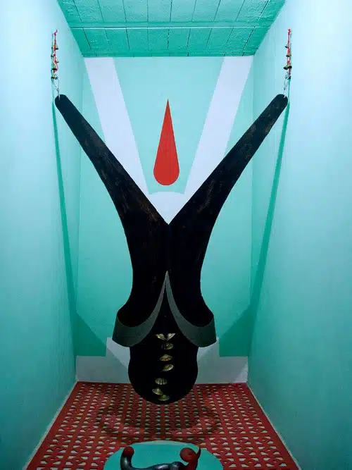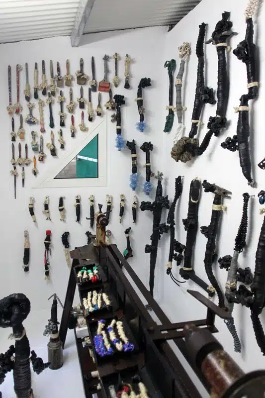 Christian Jaccard, plasticien franco-suisse, utilise des techniques tout aussi originales, en ornant ses toiles de cicatrices de feu, et en recouvrant des objets usuels avec des nœuds, créant même des outils « supranodaux ». Le concept amusait tant Vincent, que le maître des lieux construisit un petit bâtiment entièrement dédié à cette collection, appelé « la case à outils ». Roselyne pourra expliquer en détail au public toute la symbolique voulue par l’artiste.