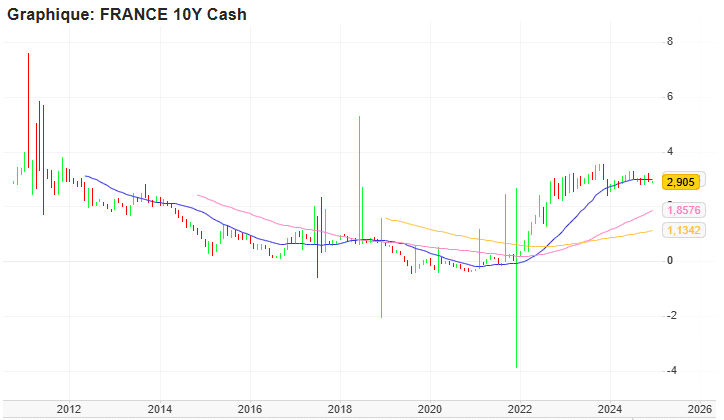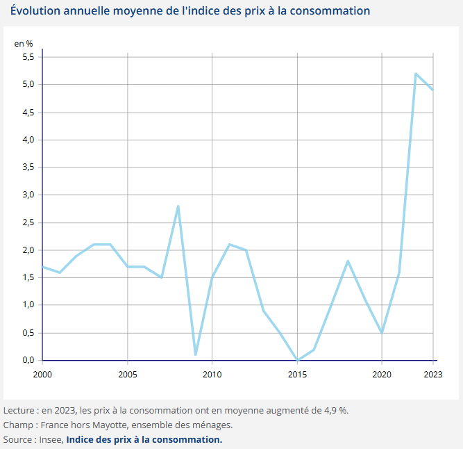 En 2023, l’inflation a fortement augmentée pour atteindre 5%. Dans le même temps, les taux d’emprunts à 10 ans étaient entre 2,8% et 3,2%. En réel, la France à donc empruntée à négatif car la valeur empruntée est inférieure au coût final de l’emprunt.