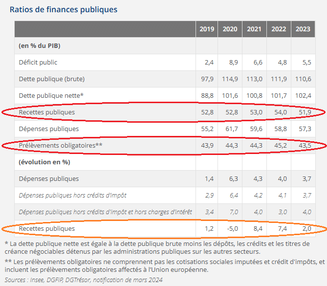 Recettes publiques et prélèvements obligatoires qui diminuent ou stagnent, particulièrement en tenant compte de l’inflation annuelle.