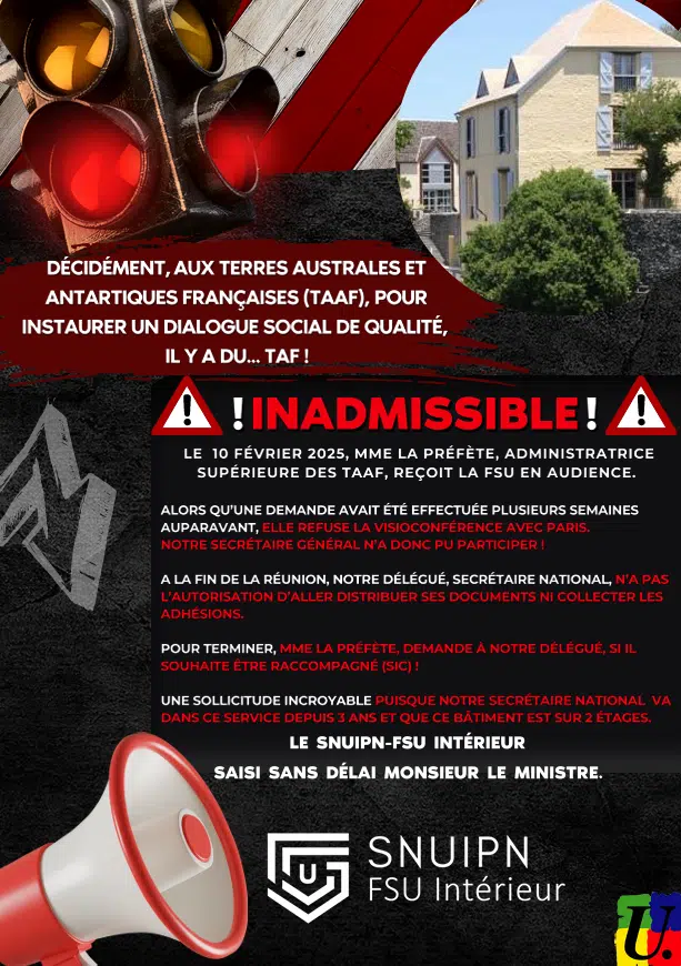La voix du syndicaliste au bout du fil est exaspérée. “Je suis délégué syndical depuis 8 ans et je n’ai jamais vu ça !”, s’exclame-t-il. “La préfète des TAAF a refusé la visio qui devait permettre à M. Benazet, Secrétaire Général et n°1 du syndicat de participer ! A l’issue de l’audience, elle a refusé que j’aille à la rencontre des collègues pour tracter, diffuser de l’information syndicale et collecter les adhésions. Et cela au prétexte qu’elle n’a pas délivré d’autorisation préalable. Elle m’a même demandé si je voulais qu’elle me raccompagne. C’est une entrave syndicale et c’est contraire à la loi.”