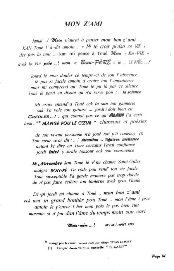 La Kour 420 s’engage à l’aider en en publiant quelques-uns à commencer par celui de ce jour, Mon zami, écrit quelques jours après la mort d’Alain Peters, et récité par Daniel Pader…