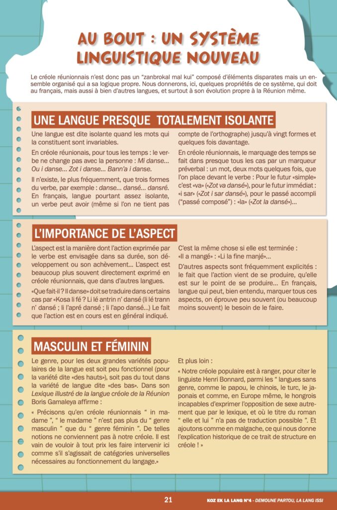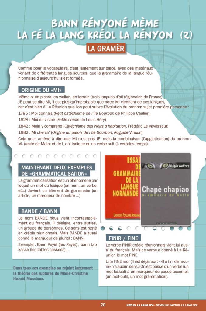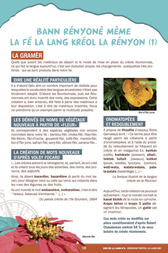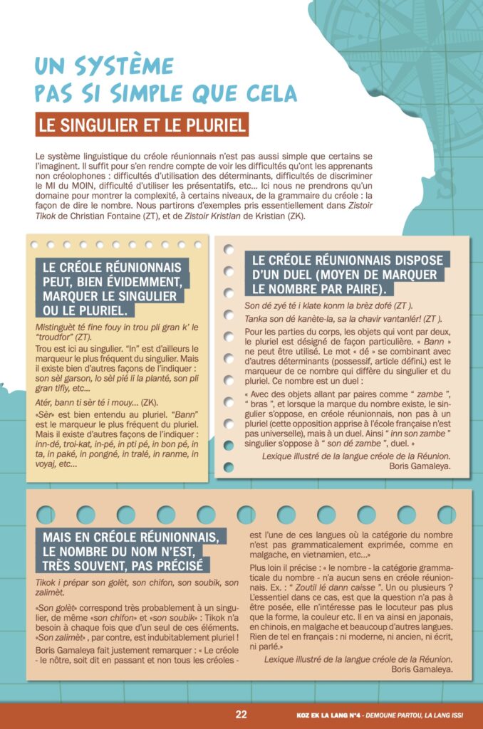 Nous vous l’annoncions en mai dernier avec une interview d’Axel Gauvin, président et l’un des membres fondateurs de Lofis Lalang : grâce à cette association, Parallèle Sud lance une série sur la langue créole, ses origines, ses subtilités, son vocabulaire… Après les origines géographiques de la langue et les historiens, nous étudions cette semaine sa grammaire. Pas si facile. Pas réellement de genre, la marque du pluriel plus proche du malgache que du français, des temps plus précis que chez Molière…