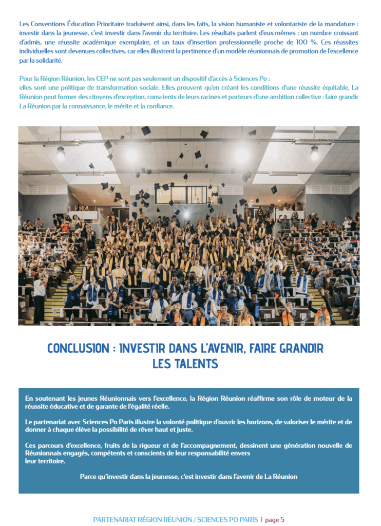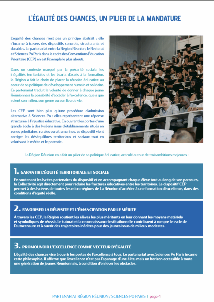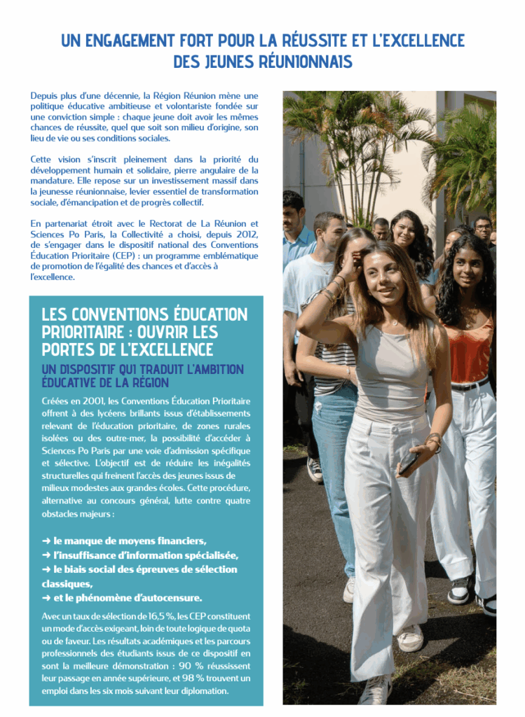 Depuis plus d’une décennie, la Région Réunion mène une politique éducative ambitieuse et volontariste fondée sur une conviction simple : chaque jeune doit avoir les mêmes chances de réussite, quel que soit son milieu d’origine, son lieu de vie ou ses conditions sociales. Cette vision s’inscrit pleinement dans la priorité du développement humain et solidaire, pierre angulaire de la mandature. Elle repose sur un investissement massif dans la jeunesse réunionnaise, levier essentiel de transformation sociale, d’émancipation et de progrès collectif. En partenariat étroit avec le Rectorat de La Réunion et Sciences Po Paris, la Collectivité a choisi, depuis 2012, de s’engager dans le dispositif national des Conventions Éducation Prioritaire (CEP) : un programme emblématique de promotion de l’é. LES CONVENTIONS ÉDUCATION PRIORITAIRE : OUVRIR LES PORTES DE L’EXCELLENCE UN DISPOSITIF QUI TRADUIT L’AMBITION ÉDUCATIVE DE LA RÉGION Créées en 2001, les Conventions Éducation Prioritaire offrent à des lycéens brillants issus d’établissements relevant de l’éducation prioritaire, de zones rurales isolées ou des outre-mer, la possibilité d’accéder à Sciences Po Paris par une voie d’admission spécifique et sélective. L’objectif est de réduire les inégalités structurelles qui freinent l’accès des jeunes issus de milieux modestes aux grandes écoles. Cette procédure, alternative au concours général, lutte contre quatre obstacles majeurs : ➜ le manque de moyens financiers, ➜ l’insuffisance d’information spécialisée, ➜ le biais social des épreuves de sélection classiques, ➜ et le phénomène d’autocensure. Avec un taux de sélection de 16,5 %, les CEP constituent un mode d’accès exigeant, loin de toute logique de quota ou de faveur. Les résultats académiques et les parcours professionnels des étudiants issus de ce dispositif en sont la meilleure démonstration : 90 % réussissent leur passage en année supérieure, et 98 % trouvent un emploi dans les six mois suivant leur diplomation.