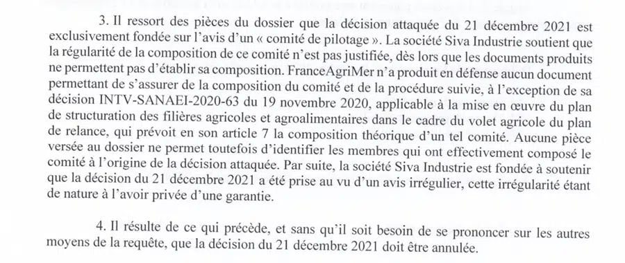 Le tribunal administratif reconnait que la décision de FranceAgriMer de rejeter le dossier porté par la petite société a été prise en se fondant exclusivement sur l’avis du “comité de pilotage”. Or, on ne sait pas qui siégeait dans ce comité. France AgriMer lui-même n’ayant pas apporté les éléments, le tribunal souligne que cette irrégularité est susceptible d’entraîner un doute sur la “garantie” de la décision. France AgriMer a trois mois pour réexaminer la demande de la SASU Siva Industrie.