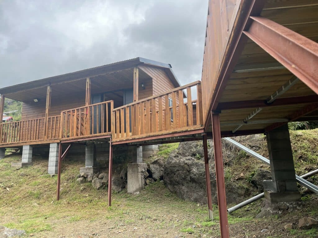 Tous les matériaux dont le couple a besoin arrivent en hélicoptère, comme quasiment tout à Mafate. Le bois, le métal, le parquet, les vis, le mobilier, les canalisations, la nourriture, tout. ‹‹ Il faut vraiment bien calculer tout ce qu’on fait, ne rien oublier dans les bas car l’hélicoptère c’est cher et si il te manque des vis par exemple, là, c’est compliqué. Au total, pour le bungalow et l’espace salle à manger, on a dû payer 15 charges en hélicoptère. Une charge c’est dans les 200 euros. ››