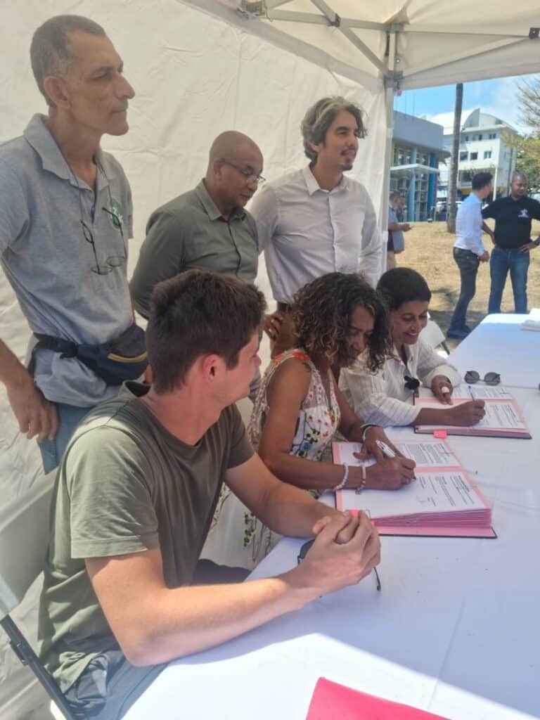Sur les conseils d’un botaniste pour le choix et l’emplacement à privilégier, le collectif 5 000 piédbwa a planté un arbre rare le 15 septembre 2024, au bord de l’eau, à Grand Anse. Le porcher est une espèce en voie d’extinction. Avec le projet controversé de travaux d’agrandissement du bassin souhaité par le maire de Petite-Île, le dernier rempart sera un arbre. « On l’a planté pour sa dimension symbolique », explique Marie Faham. « Si les engins arrivent jusqu’à l’arbre, on aura perdu quelque chose de très cher. Si l’arbre est touché, cela signifiera que Grand-Anse est vraiment menacé. »