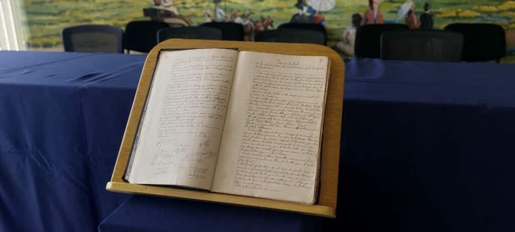Lors de ce conseil municipal, le Maire du Tampon Patrice Thien Ah Koon a présenté aux membres du conseil le registre contenant le procès-verbal du tout premier Conseil Municipal de la commune du Tampon, datant du 2 juillet 1925.