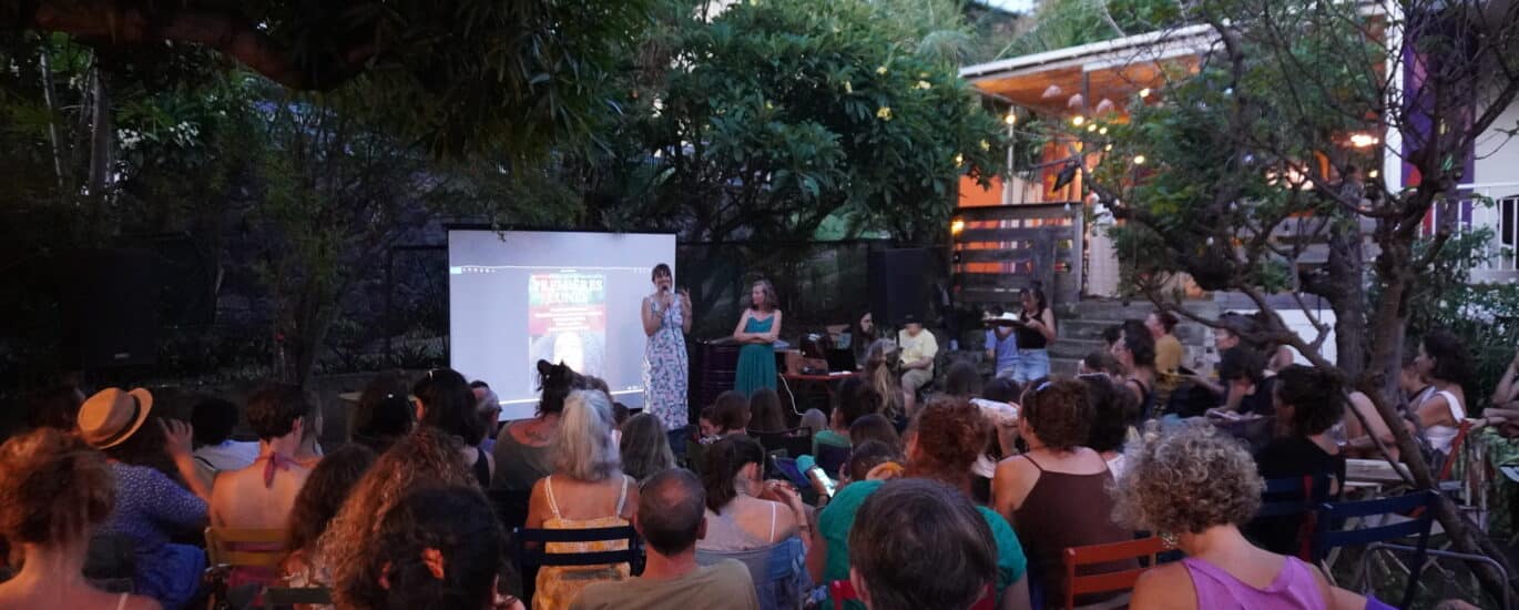 La nuit tombe, les luminaires éclairent le lieu. Le public, majoritairement composé de femmes, s’installe autour des chaises et des tables prévues pour la projection. L’ambiance est chaleureuse, en cette nuit d’été. On entend rire, discuter, trinquer. Le week-end commence…
