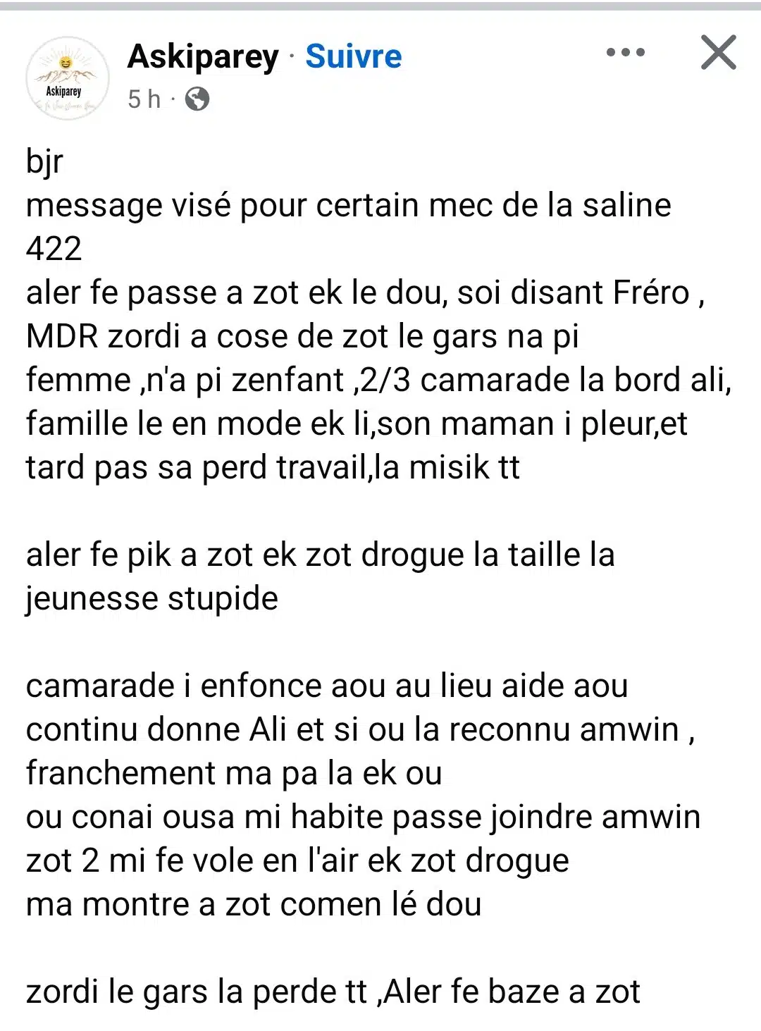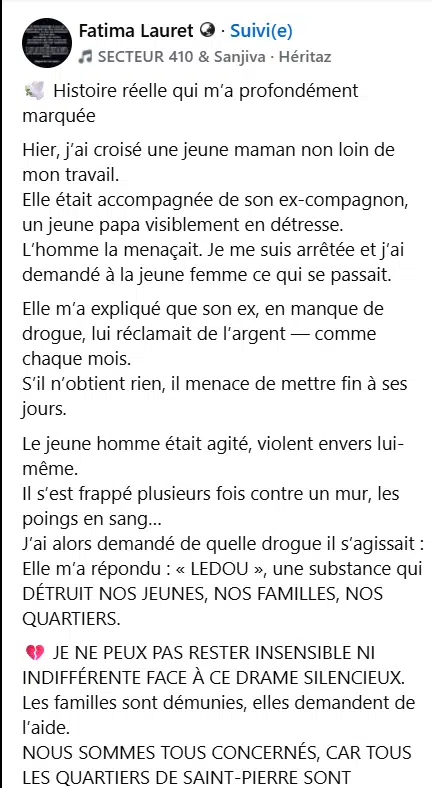 Fatima Lauret le sait bien. Auparavant médiatrice sociale à Bois-d’Olive, elle travaille désormais à la maison des familles de Basse-Terre. Femme courage si précieuse dans ces quartiers, elle partage ses engagements sur Facebook : appel à la solidarité pour un gramoun isolé dans un logement insalubre, ou pour une mère de famille dont l’appartement est infesté de mites. Mais aussi ses coups de gueule, comme lorsqu’elle est témoin d’une violente scène entre un père de famille et son ex-compagne qui menace de mettre fin à ses jours s’il n’obtient pas d’argent pour payer sa dose de dou.