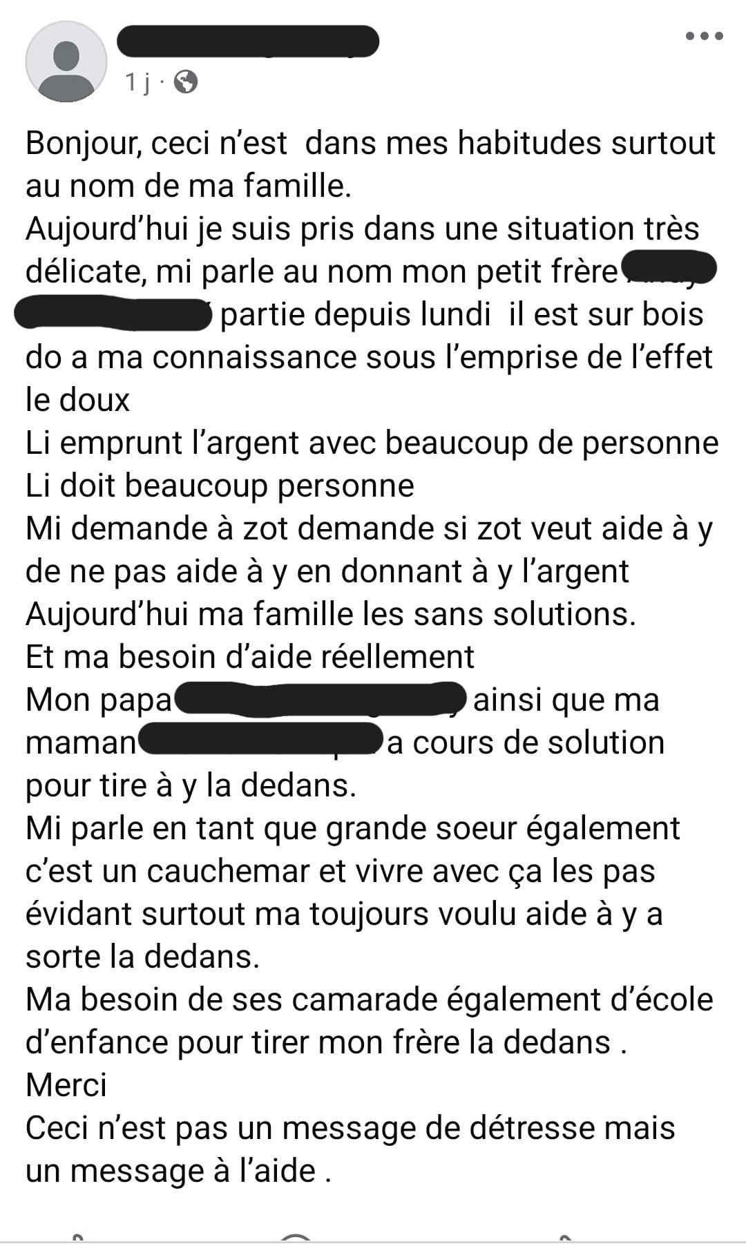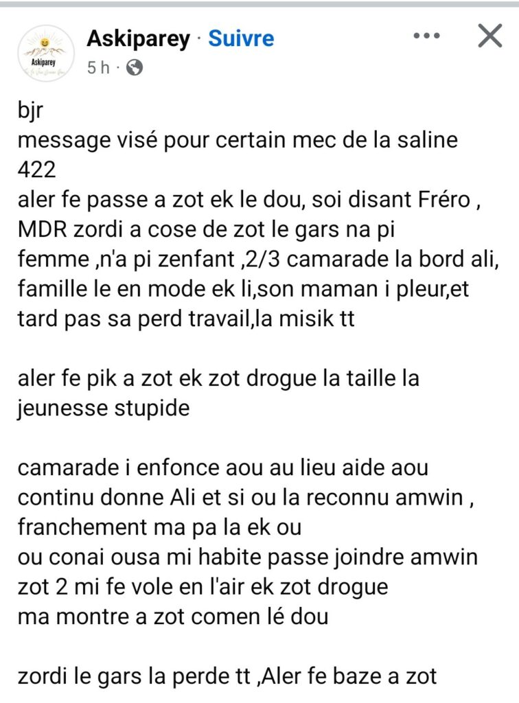 Fatima Lauret le sait bien. Auparavant médiatrice sociale à Bois-d’Olive, elle travaille désormais à la maison des familles de Basse-Terre. Femme courage si précieuse dans ces quartiers, elle partage ses engagements sur Facebook : appel à la solidarité pour un gramoun isolé dans un logement insalubre, ou pour une mère de famille dont l’appartement est infesté de mites. Mais aussi ses coups de gueule, comme lorsqu’elle est témoin d’une violente scène entre un père de famille et son ex-compagne qui menace de mettre fin à ses jours s’il n’obtient pas d’argent pour payer sa dose de dou.