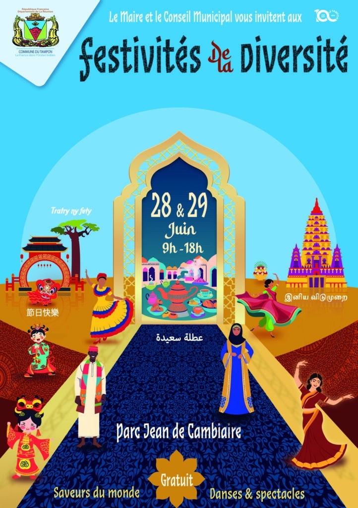 Le Maire du Tampon et le Conseil Municipal ont le plaisir de vous inviter aux « Festivités de la Diversité » les 28 et 29 juin, de 9h à 18h, au Parc Jean de Cambiaire!