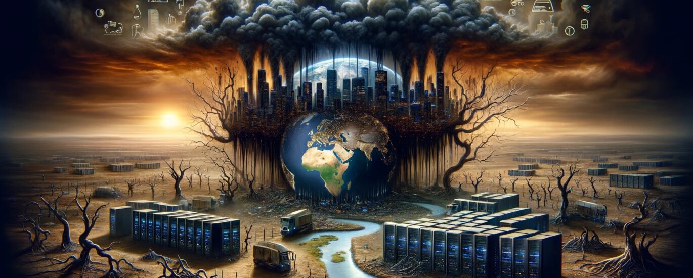 Image et légende générées par DALL-E: Voici une illustration représentant l’impact environnemental des modèles de langage IA. Cette image met en évidence un centre de données avec des serveurs connectés à une centrale électrique émettant de la fumée, symbolisant la consommation d’énergie et les émissions de CO2. Au premier plan, des icônes représentent la consommation d’électricité, les émissions de CO2 et l’extraction de ressources naturelles. En arrière-plan, un globe souligne l’ampleur mondiale de cet impact.