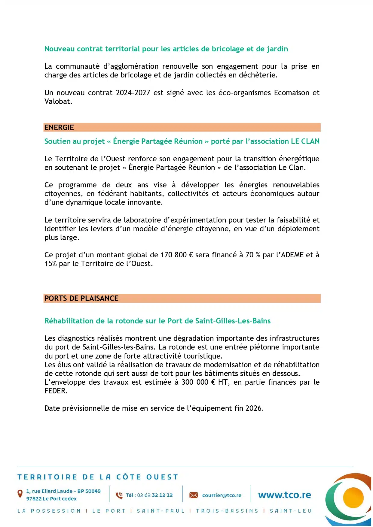 Sous la présidence d’Emmanuel Séraphin, les élus du Bureau Communautaire du 6 octobre 2025 ont eu à se prononcer notamment sur les garanties d’emprunts, le projet « Énergie Partagée Réunion », les lauréats de l’appel à projets Lékol’O ou encore le soutien aux associations dans le cadre de la lutte anti vectorielle…
