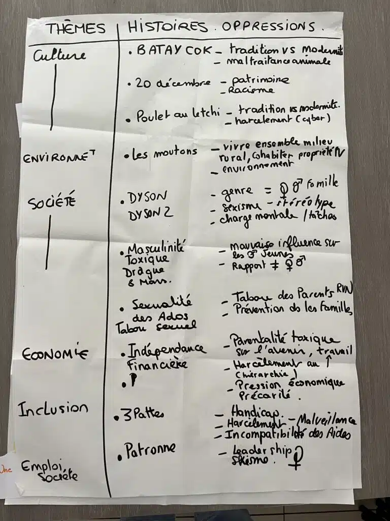 Le théâtre forum ou théâtre de l’opprimé par « la troup’ JB4 » réunit six jeunes volontaires et un tuteur, Matthieu Mansard, lui-même passé par l’association pendant son service civique. « L’éducation populaire que l’association dispense m’a beaucoup plu et m’a aussi donné envie de revenir. C’est suite à une formation sur le théâtre forum que la troupe s’est créée ». Ensemble, avec la parole des habitants, ils donnent naissance à des pièces écrites sur différents thèmes comme le climat, la violence intra-familiale, les oppressions, la masculinité toxique, le racisme, l’environnement, le sexisme…