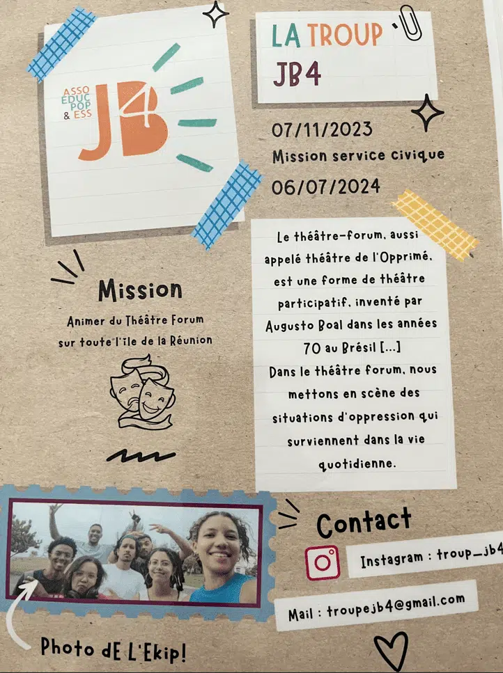 En se concentrant sur des quartiers un peu partout sur l’île depuis 2012, l’association JB4 compte 17 salariés polyvalents accompagnés de 18 volontaires en service civique. Elle aide les citoyens à donner naissance à leurs propres projets. Par exemple, « la troup’ JB4 » ou théâtre forum, aborde les sujets comme le climat, la violence intra-familiale, les oppressions, la masculinité toxique, le racisme, etc.