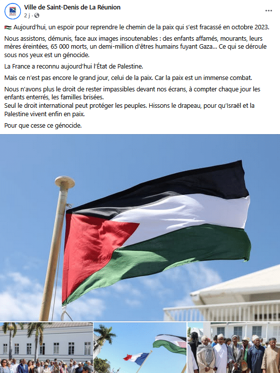 Sur la même plateforme, la ville de Saint-Denis avait annoncé « Nous assistons, démunis, face aux images insoutenables : des enfants affamés, mourants, leurs mères éreintées, 65 000 morts, un demi-million d’êtres humains fuyant Gaza… Ce qui se déroule sous nos yeux est un génocide. La France a reconnu aujourd’hui l’État de Palestine. »