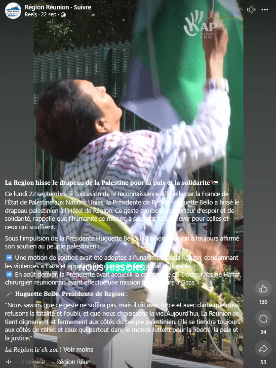 Sur Facebook, la Région avait commenté son action « Ce lundi 22 septembre, à l’occasion de la reconnaissance officielle par la France de l’État de Palestine aux Nations Unies, la Présidente de Région Huguette Bello a hissé le drapeau palestinien à l’Hôtel de Région. Ce geste symbolique, porteur d’espoir et de solidarité, rappelle que l’humanité se mesure à sa capacité à se lever pour celles et ceux qui souffrent. »