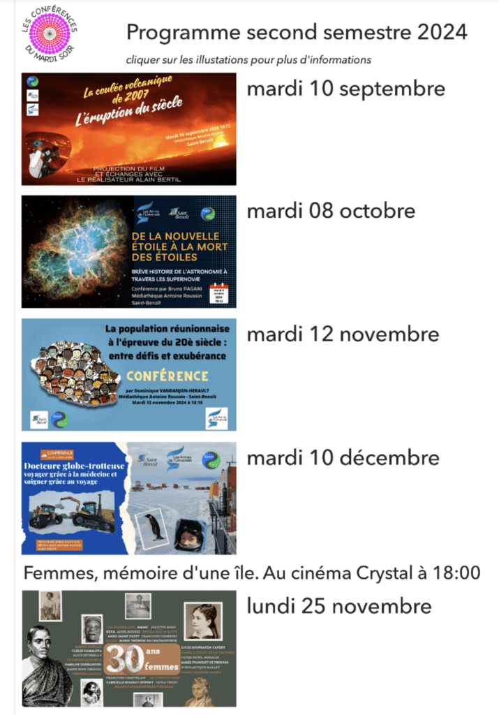 Dans les contours que nous avons définis, nous avons décidé de proposer une conférence tous les seconds mardis de mois, en alternant thèmes sur La Réunion et thèmes généralistes. Un logo a été retenu et le graphiste du service communication de la Mairie, sur suggestions des partenaires, élabore une affiche qui mêle esthétique et informations.