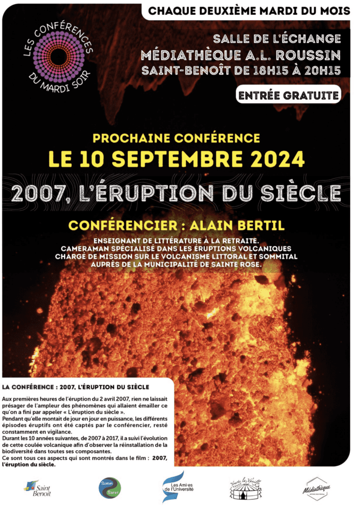 Notre prochaine conférence aura lieu le mardi 10 septembre, à la salle de l’Échange de la Médiathèque Antoine Roussin de Saint Benoît de 18H15 à 20H15. Elle porte sur la coulée de 2007. Alain Bertil, le réalisateur du film sur cette éruption qu’il a suivie de ses premiers balbutiements jusqu’à aujourd’hui, animera la soirée.