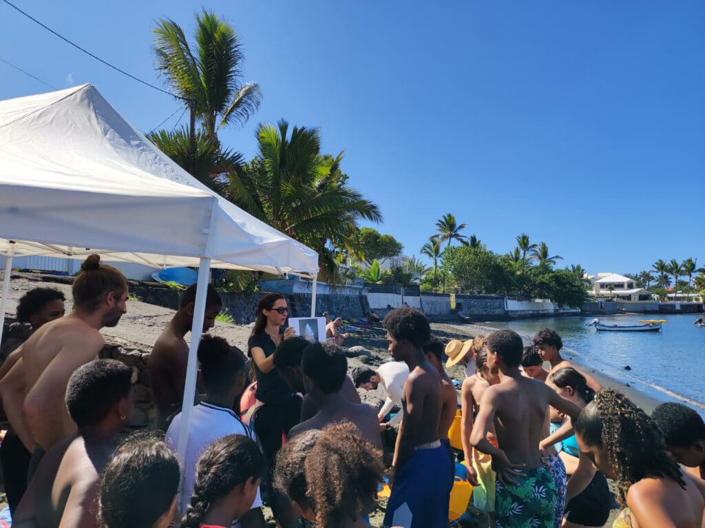 Sous un soleil de plomb, sur la plage de L’Etang-Salé, les enfants arrivent à la queue-leu-leu. Deux enfants par classe, sur 12 classes, ont été conviés à cette matinée de sensibilisation. Ils sont tous.tes éco-délégués, et ont été élu.e.s par leur classe pour participer à des actions de protection de l’environnement et être ambassadeur.rices de la transition écologique auprès des autres élèves de leur établissement. Sous la tonnelle blanche, les enfants se rassemblent autours de la Caroline Massac, l’initiation commence par une première question: Pensez-vous que le corail est un animal ou un minéral? D’un ton assuré, plusieurs d’entre eux répondent du tac au tac: un minéral. Le premier point est gagné pour la scientifique, ils repartiront déja avec le fait d’avoir compris que le corail est un animal vivant, et fragile, qui nécessite qu’on en prenne soin.