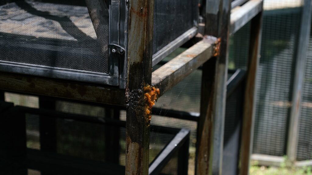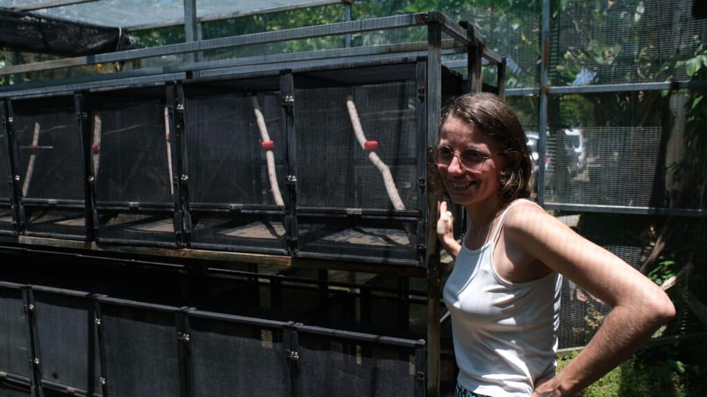 A l’arrière de la case qui sert de siège à l’association, à Petite-Île, une cinquantaine de terrariums au décors spartiate sont alignés. Chaque cage n’accueille qu’un individu, une branche et un morceau de tube en PVC pour abris. En tout cas quand les cages sont vides comme elles l’étaient quand nous les avons visitées. «Quand il y a des geckos, les cages sont agrémentées de multiples supports végétaux, afin de créer un cadre de vie favorable aux geckos, avec des plantes issues de notre pépinière, qui sont des plantes que les geckos vont retrouver dans leur milieu naturel (petits vacoas, manioc bord de mer, feuilles de chocas…). Si l’on ne mettait aux geckos qu’une branche et un petit tube PVC, cela poserait de gros problèmes d’éthique !», précise Chloé Bernet. Ils sont nourris quotidiennement de fleurs dont les lézards consomment le nectar, des fleurs de manioc bord de mer, de saliette, le sucre des vacoas et des grillons deux fois par semaine. Ces animaux sont placides et ne se déplacent pas beaucoup. Ils peuvent vivre toute leur vie dans le même arbre, se nourrissant de beaucoup d’insectes.