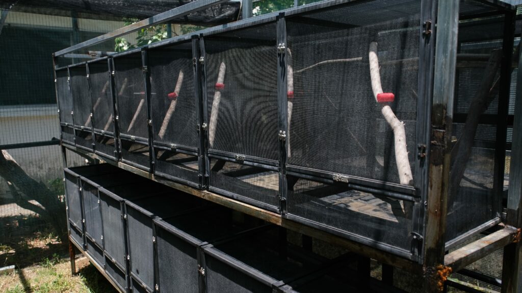 Une cinquantaine de terrariums accueillent les juvéniles Phelsuma inexpectata pour les faire grossir avant leur réintroduction dans leur milieu naturel