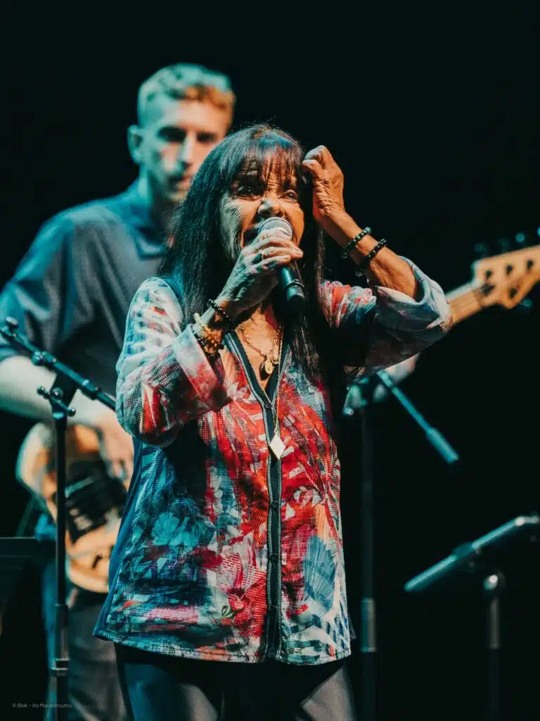 Dès son entrée sur scène sous un tonnerre d’applaudissements, Jacqueline Farreyrol, artiste emblématique de notre île, impose une présence douce et lumineuse. Sa voix, toujours aussi limpide et chargée d’authenticité, caresse la salle avec des titres intemporels,  “Roule ton maloya”, “Touche pas mon zistoire”, “Mamzelle Babouk”… entre autres, mais aussi une énergie et une passion partagée sur l’incontournable “Ça sent la banane” qui entraîne le public dans une chorégraphie joyeuse qui se termine par une standing ovation.