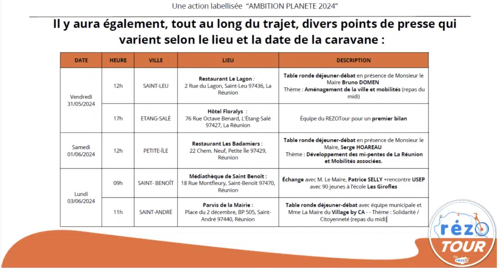 Le REZOTour est un tour de l’île, exclusivement effectué grâce à des véhicules faisant partie des modes de transport doux et durables. Une caravane de 10 participants partira dès le vendredi 31 mai 2024 à 8h30 de la Ville du Port. Ce mouvement a pour vocation à être pérennisé et de convaincre chaque année de plus en plus de Réunionnais à l’utilité et la praticité des autres modes de déplacement.