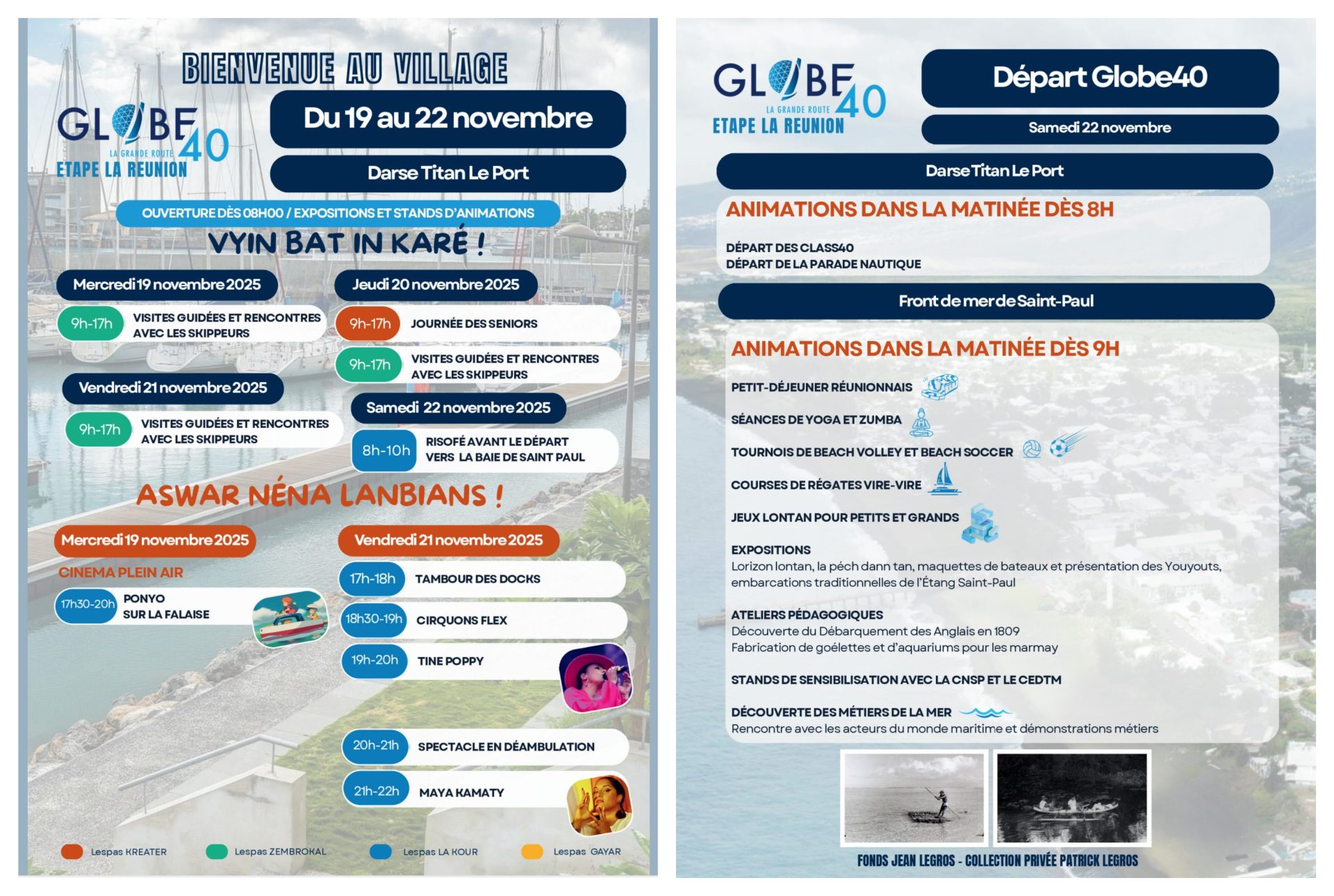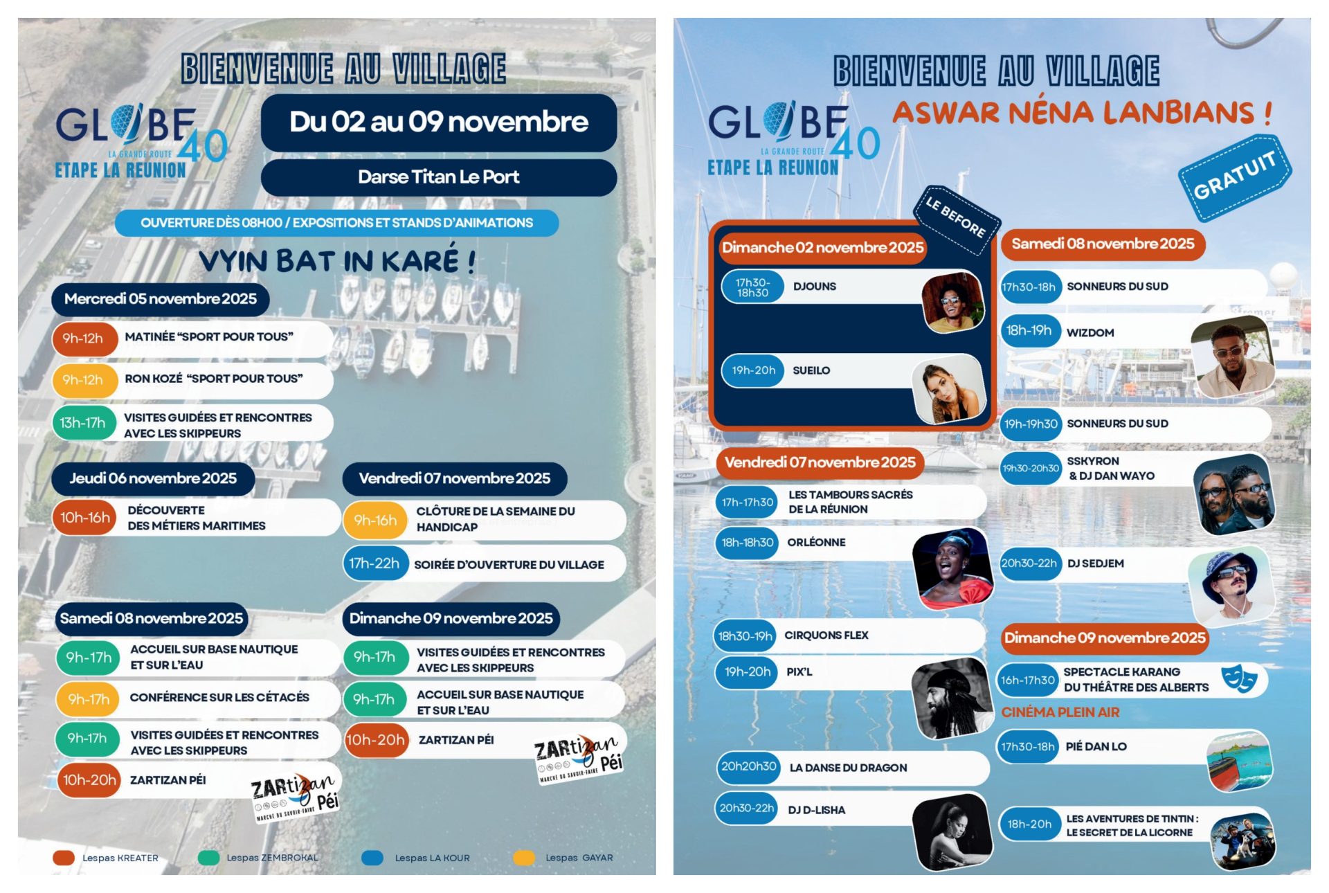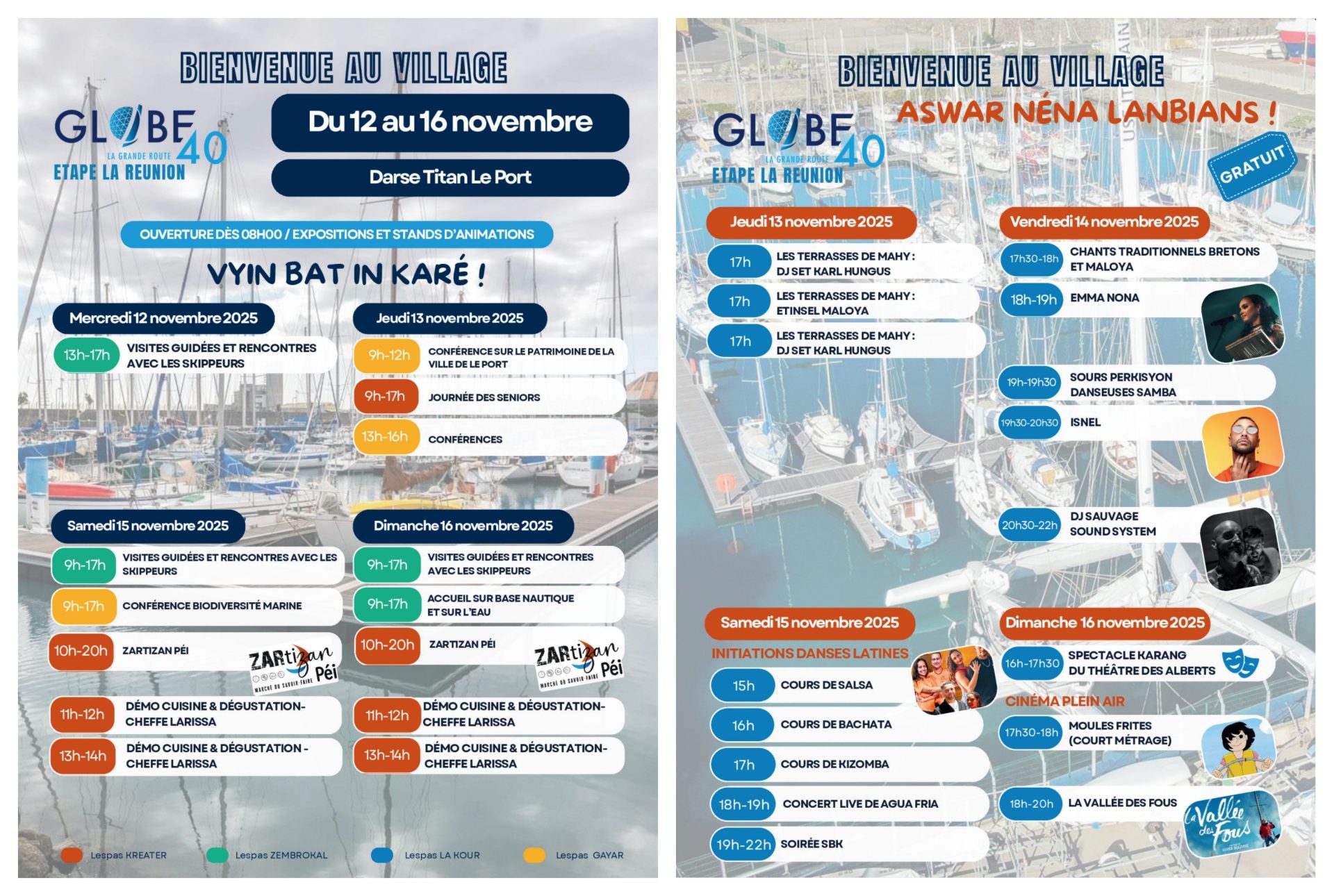 Consultez le programme complet du Village Globe40 ou rdv sur la page “Village Globe40 – Étape La Réunion”