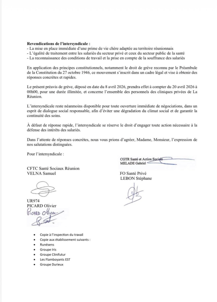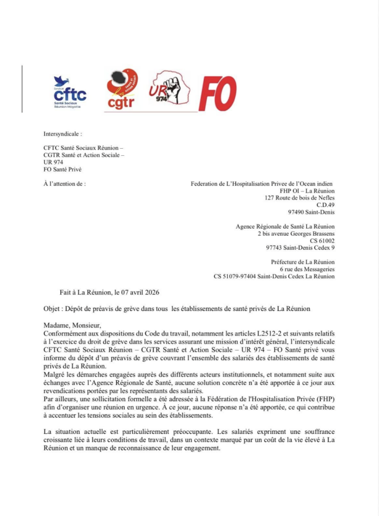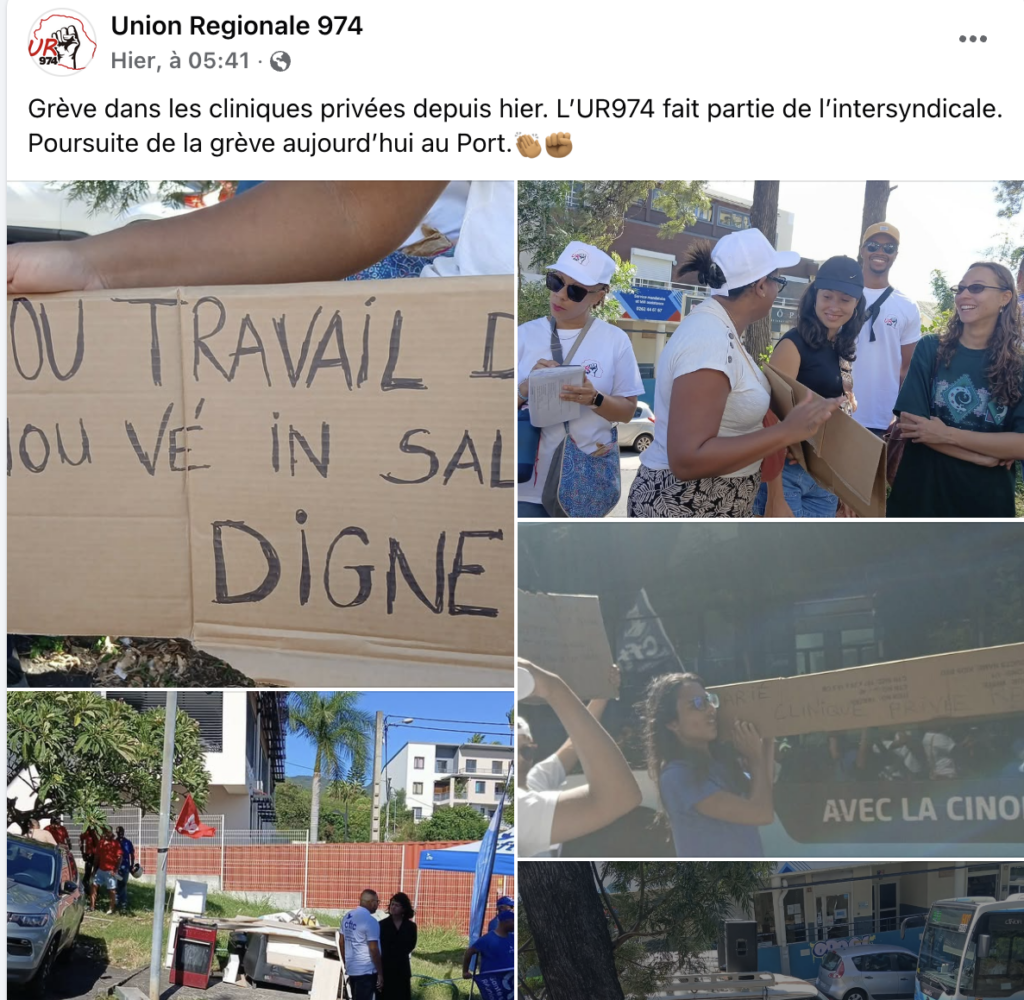 Le mouvement de grève avait commencé ce lundi, quand des soignants du secteur privé s’étaient donné rendez-vous devant la clinique de Sainte-Clotilde, puis devant les cliniques des Flamboyants et des Orchidées, au Port, ce mardi 21 avril. Le point de départ de la grève ? Une rencontre avec l’ARS n’ayant pas abouti à des avancées satisfaisantes selon l’intersyndicale (CFTC Santé et Sociaux Réunion, CGTR Santé-et Action sociale FO, et UR974).