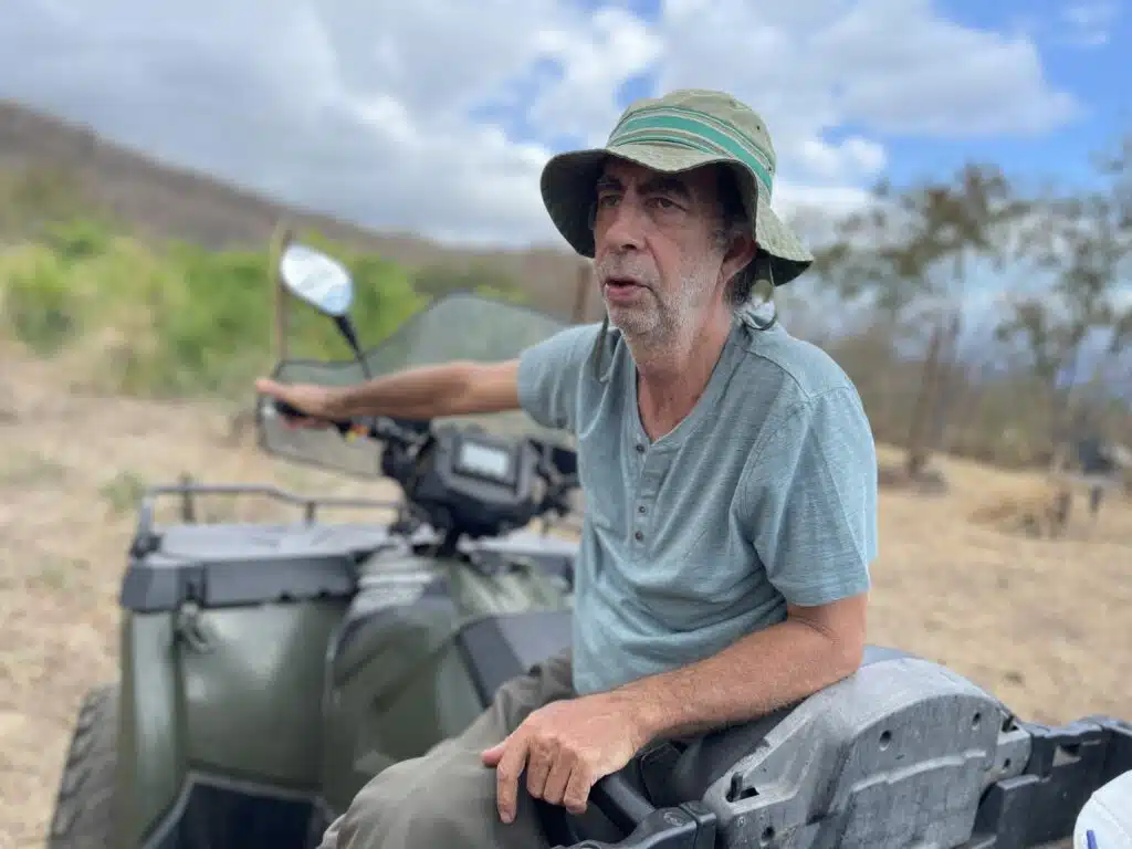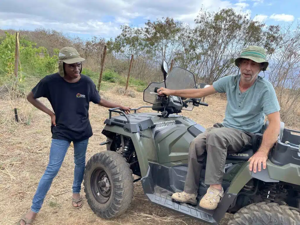 « On a trois variétés, deux de raisin blanc : le muscat de Saint Valliers et une autre non identifiée dont la souche est Saint-Leusienne et une de rouge, le fameux raisin Isabelle » nous explique Stéphane, le père. Stéphane Thébaudin a été à la pointe de l’innovation de la filière spiruline à La Réunion dans les années 2010. Aujourd’hui, il expérimente la vigne dans les hauts de Saint-Leu où il transmet son savoir et sa passion à son fils fraichement bachelier du lycée agricole de Saint-Joseph. Stéphane surmonte son handicap grâce à son quad tous-terrains qui lui permet d’accompagner Florian sur la vigne.
