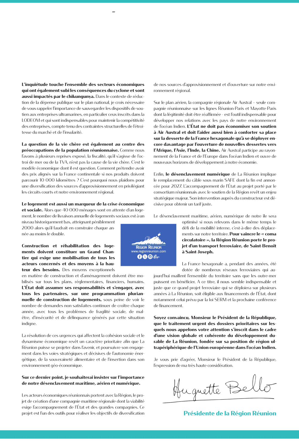 Avant la visite du Président de la République à La Réunion, la Présidente de RégionHuguette Bello lui adresse une lettre ouverte qui rappelle, notamment, que l’urgence sociale et sanitaire exige des réponses immédiates.