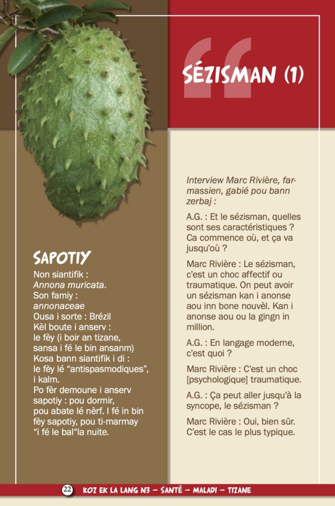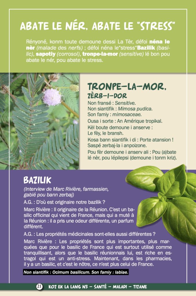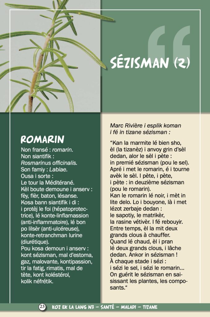 Stress, nerfs à bout, sézisman… quand on a besoin de calme, la tisane est reine. Cette semaine, grâce à Lofis Lalang, romarin, basilic et sapotille sont à l’honneur. Les tisanes, cette médecine de quand il n’y en avait pas avait été présentée par Lofis Lalang dans une exposition en 2012. Comme le dit elle même l’association, nous ne sommes ni médecins ni tisaneurs, les informations publiées ne doivent donc pas être utilisées sans l’avis d’un professionnel, médical ou de l’herboristerie. Nous vous l’annoncions en mai dernier avec une interview d’Axel Gauvin, président et l’un des membres fondateurs de Lofis Lalang : grâce à cette association, Parallèle Sud publie une série sur la langue et la culture créole, ses origines, ses subtilités, son vocabulaire…