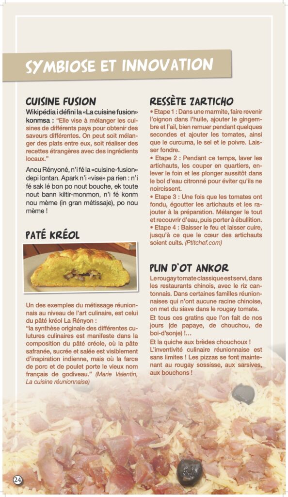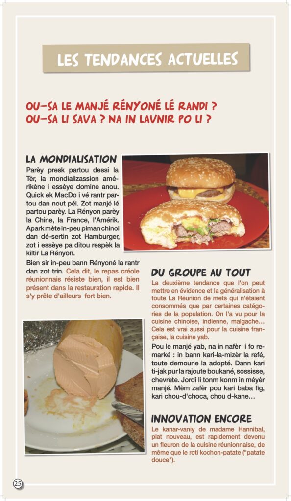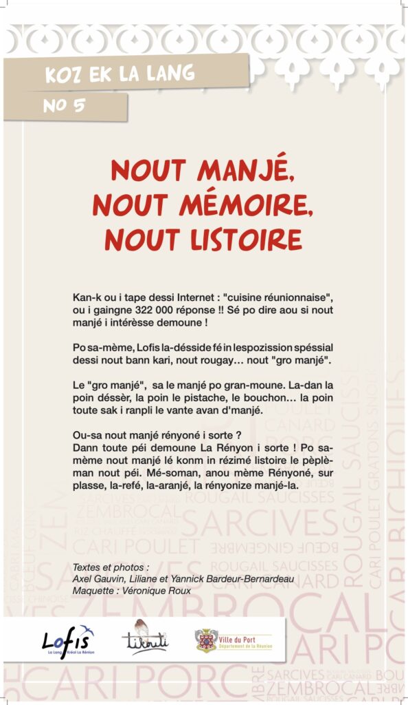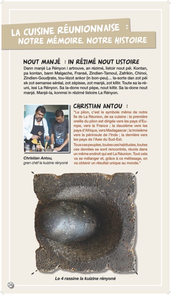 Nous vous l’annoncions en mai dernier avec une interview d’Axel Gauvin, président et l’un des membres fondateurs de Lofis Lalang : grâce à cette association, Parallèle Sud publie une série sur la langue créole, ses origines, ses subtilités, son vocabulaire… La langue, la culture, c’est aussi la gastronomie, alors, pour terminer notre série sur ce sujet et après les origines de « nout manzé », nous abordons les nouveautés qui font déjà partie du patrimoine, comme le fameux canard à la vanille d’Eva Annibal (ndlr : et non Hannibal comme écrit ci-dessous) créé il y a quelques années à l’occasion d’un concours de cuisine de la foire de Bras-Panon.