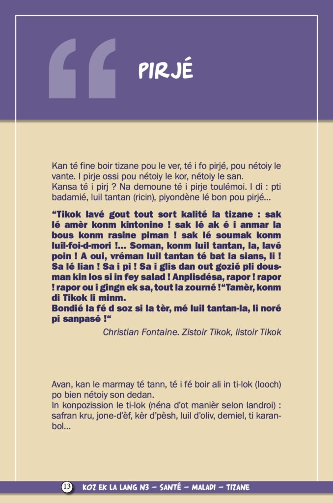 Nous poursuivons cette semaine notre série sur les tisanes. Deux maux courants, la fièvre et les parasites intestinaux, qu’il fallait bien pouvoir traiter sans aspirine ni traitements chimiques. Cette médecine de quand il n’y en avait pas avait été présentée par Lofis Lalang dans une exposition en 2012. Comme le dit elle même l’association, nous ne sommes ni médecins ni tisaneurs, les informations publiées ne doivent donc pas être utilisées sans l’avis d’un professionnel, médical ou de l’herboristerie. Nous vous l’annoncions en mai dernier avec une interview d’Axel Gauvin, président et l’un des membres fondateurs de Lofis Lalang : grâce à cette association, Parallèle Sud publie une série sur la langue et la culture créole, ses origines, ses subtilités, son vocabulaire…