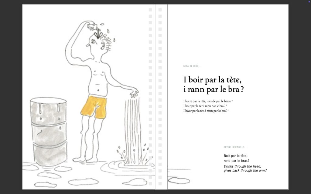 Toujours avec Lofis Lalang, Parallèle Sud présente cette semaine trois sirandanes tirées d’un livre édité par l’association militante pour la langue créole en partenariat avec l’association Tikouti. La sirandane, quelque part entre la devinette et la charade, est un exercice de style propre à la culture réunionnaise, des petites énigmes pour amuser et cultiver les enfants, commencent toujours par la formule « kosa in soz ? ». Les dessins sont de Patrick Booz. La première page présente l’énigme à découvrir, la seconde la réponse.