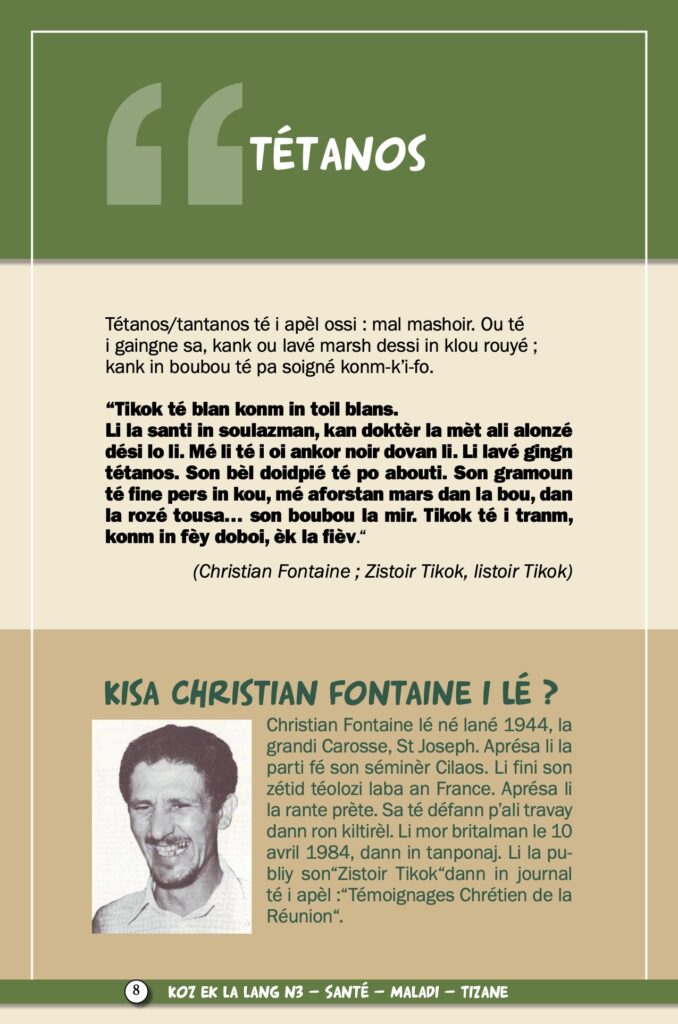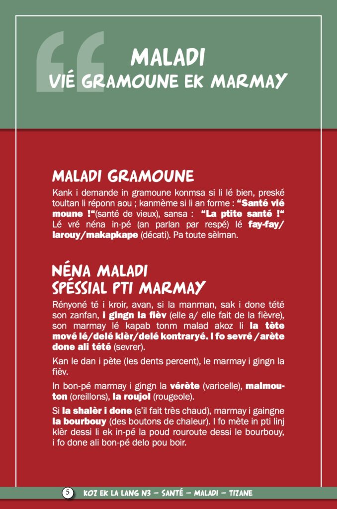 A propos des tisanes, l’un des « zarboutans » de la culture locale, il est question aujourd’hui du « safran » et du « guéri-vite ». Cette médecine de quand il n’y en avait pas avait été présentée par Lofis Lalang dans une exposition en 2012. Comme le dit elle même l’association, nous ne sommes ni médecins ni tisaneurs, les informations publiées ne doivent donc pas être utilisées sans l’avis d’un professionnel, médical ou de l’herboristerie. Nous vous l’annoncions en mai dernier avec une interview d’Axel Gauvin, président et l’un des membres fondateurs de Lofis Lalang : grâce à cette association, Parallèle Sud publie une série sur la langue créole, ses origines, ses subtilités, son vocabulaire…