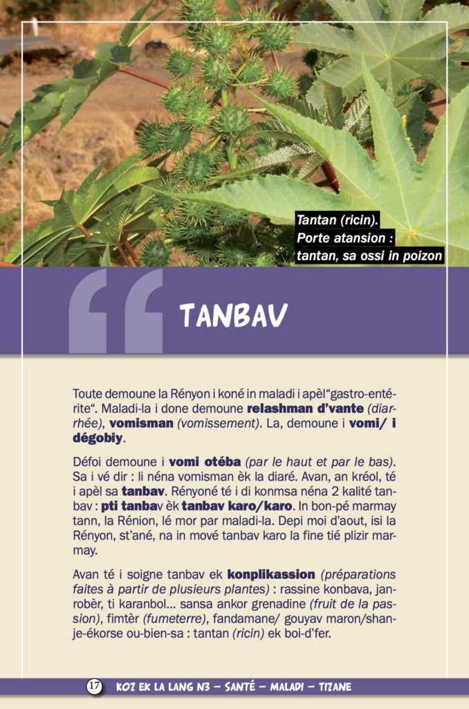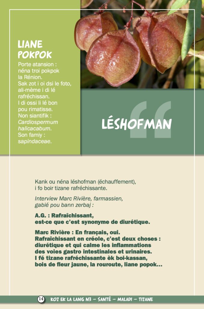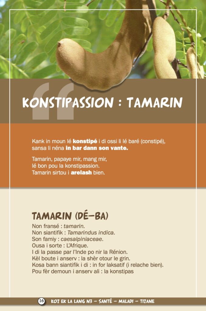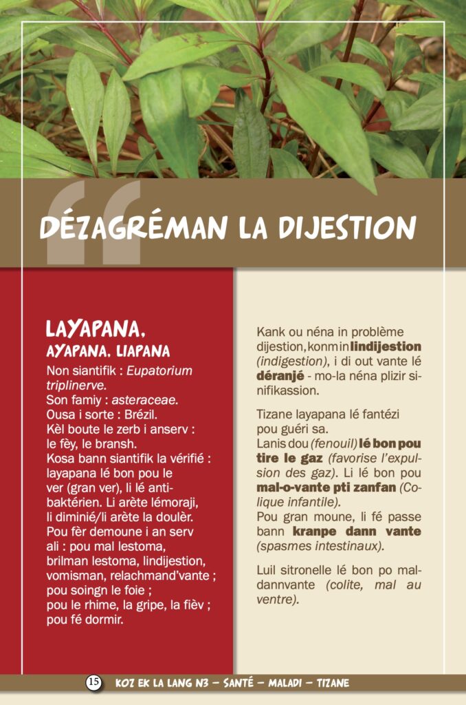 Après les antipyrétiques et vermifuges, notre série sur les tisanes présente cette semaine les remèdes traditionnels contre les maux de ventre. De notre propre expérience, l’ayapana est souverain pour soulager les nourrissons. Cette médecine de quand il n’y en avait pas avait été présentée par Lofis Lalang dans une exposition en 2012. Comme le dit elle même l’association, nous ne sommes ni médecins ni tisaneurs, les informations publiées ne doivent donc pas être utilisées sans l’avis d’un professionnel, médical ou de l’herboristerie. Nous vous l’annoncions en mai dernier avec une interview d’Axel Gauvin, président et l’un des membres fondateurs de Lofis Lalang : grâce à cette association, Parallèle Sud publie une série sur la langue et la culture créole, ses origines, ses subtilités, son vocabulaire…
