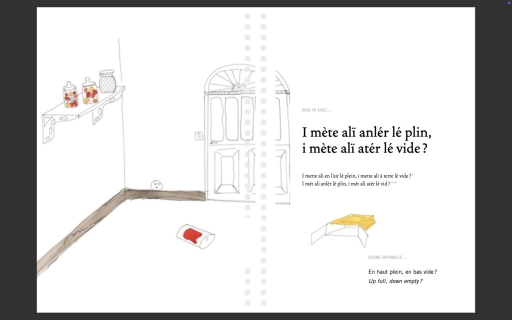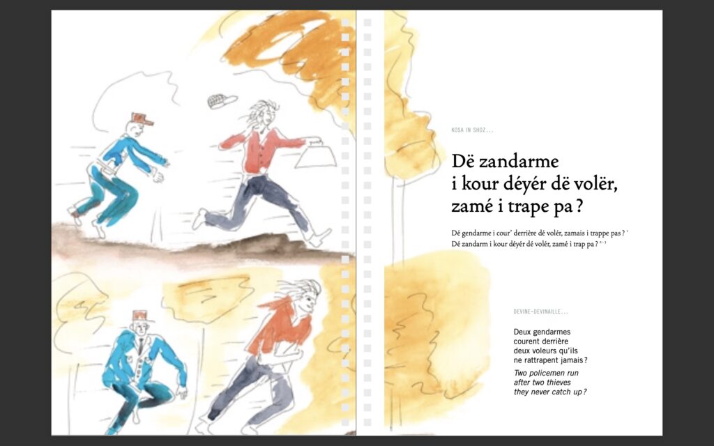 Toujours avec Lofis Lalang, Parallèle Sud présente encore cette semaine trois nouvelles sirandanes tirées d’un livre édité par l’association militante pour la langue créole en partenariat avec l’association Tikouti. La sirandane, quelque part entre la devinette et la charade, est un exercice de style propre à la culture réunionnaise, des petites énigmes pour amuser et cultiver les enfants; Elle commence toujours par la formule « kosa in soz ? ». Les dessins sont de Patrick Booz. La première page présente l’énigme à découvrir, la seconde la réponse.