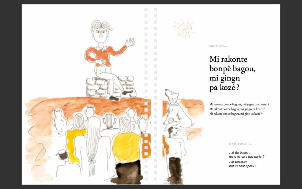 Toujours avec Lofis Lalang, Parallèle Sud présente encore cette semaine trois nouvelles sirandanes tirées d’un livre édité par l’association militante pour la langue créole en partenariat avec l’association Tikouti. La sirandane, quelque part entre la devinette et la charade, est un exercice de style propre à la culture réunionnaise, des petites énigmes pour amuser et cultiver les enfants; Elle commence toujours par la formule « kosa in soz ? ». Les dessins sont de Patrick Booz. La première page présente l’énigme à découvrir, la seconde la réponse.