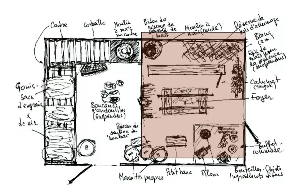 * Le brancard (« bankar« ) recouvre la moitié de la cuisine, au-dessus du foyer (à droite sur le croquis)