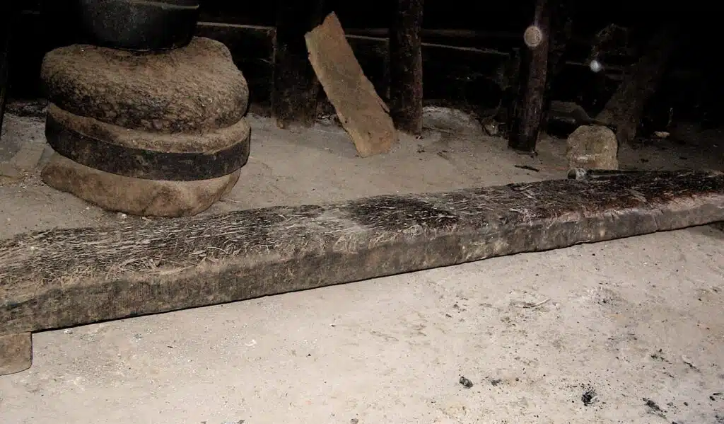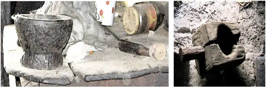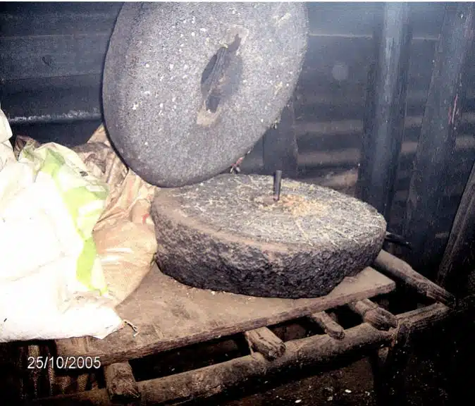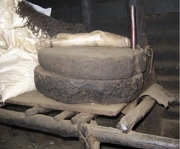 Les moulins à maïs (moulin maï). Celui installé sur son support est encore utilisé.