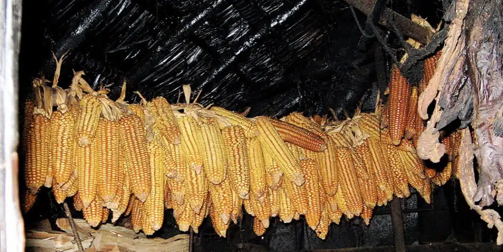 Si le maïs de consommation est conservé, entassé sur le bankar, les épis de maïs suspendus en fourche et soigneusement alignés sont destinés aux semences de l’année suivante.